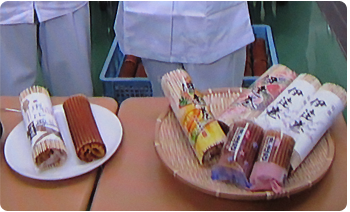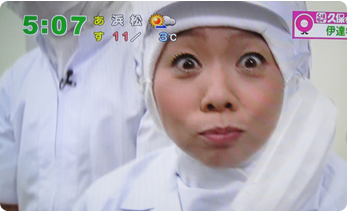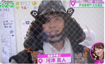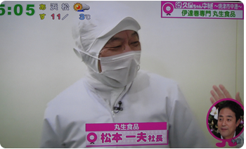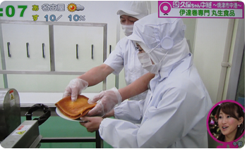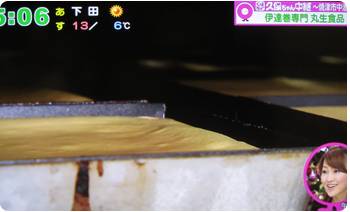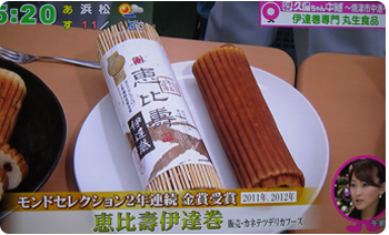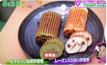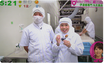 2012年12月6日(木)に静岡だいいちテレビ「静岡まるごとワイド!」にて工場から生中継で紹介されました。自称静岡のアイドル久保ひとみさんこと「久保ちゃん」が伊達巻の製造工程を紹介し、出来たての味を試食されました。また新商品の「レーズン入り白い伊達巻」と「あずき入り抹茶伊達巻」も紹介していただきました。気象予報士の河津さんにも伊達巻の由来の一つである伊達正宗の恰好で伊達巻を召し上がっていただきました。寒い中ありがとうございました!